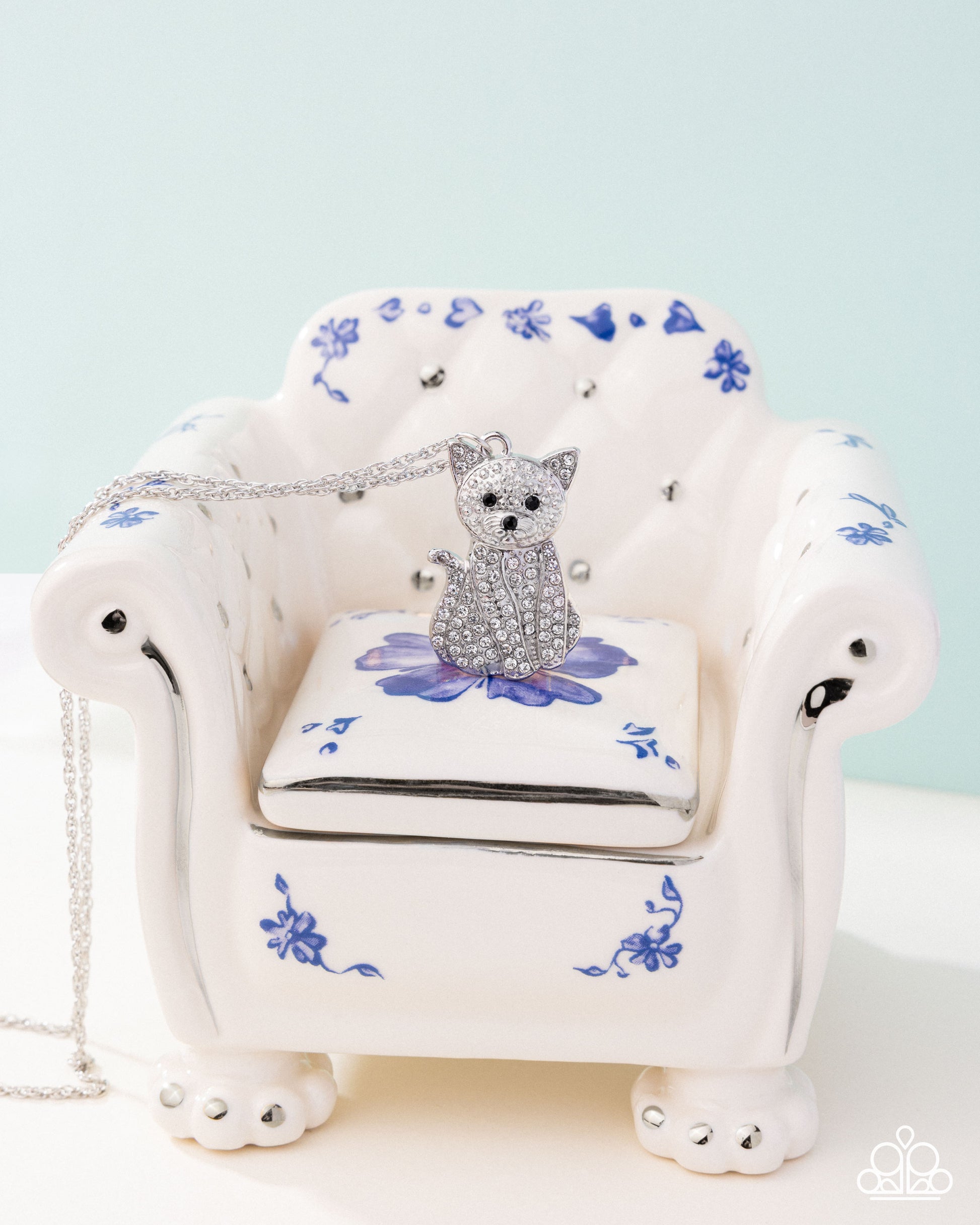 A delicate silver chain showcases a dazzling cat pendant. Encrusted with glittering rhinestones, the cat charm is given a whimsical yet sophisticated look. Its black rhinestone eyes and nose add an adorable contrast to the design, making it a charming accessory for any cat lover. Features an adjustable clasp closure.