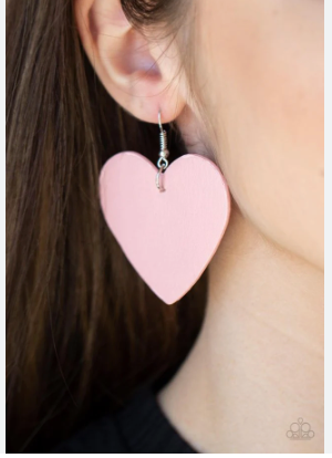 A pink leather heart frame swings from the ear for a flirtatious pop of color. Earring attaches to a standard fishhook fitting.