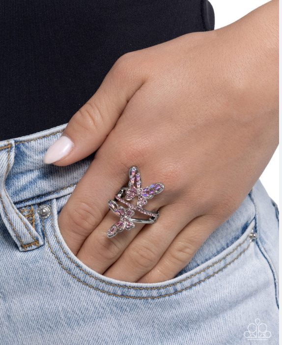 Two silver butterflies, encrusted with radiant pink rhinestones and sparkling UV baguette-cut accents, flutter across a layered band. The intricate detailing creates a whimsical and enchanting design, perfect for adding a pop of color and elegance to any look. Features a stretchy band for a flexible fit.