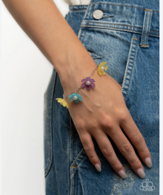Dotted with white pearly centers, dainty sea glass-like turquoise, yellow, and purple flowers bloom across a dainty silver paperclip chain along the wrist, invoking a festive spirit. Features an adjustable clasp closure.