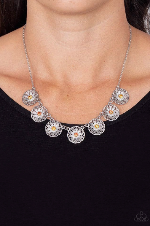 Dotted with dark and light orange rhinestone centers, decorative silver flowers bloom from circular silver frames as they link below the collar for a flirtatious floral fashion. Features an adjustable clasp closure.