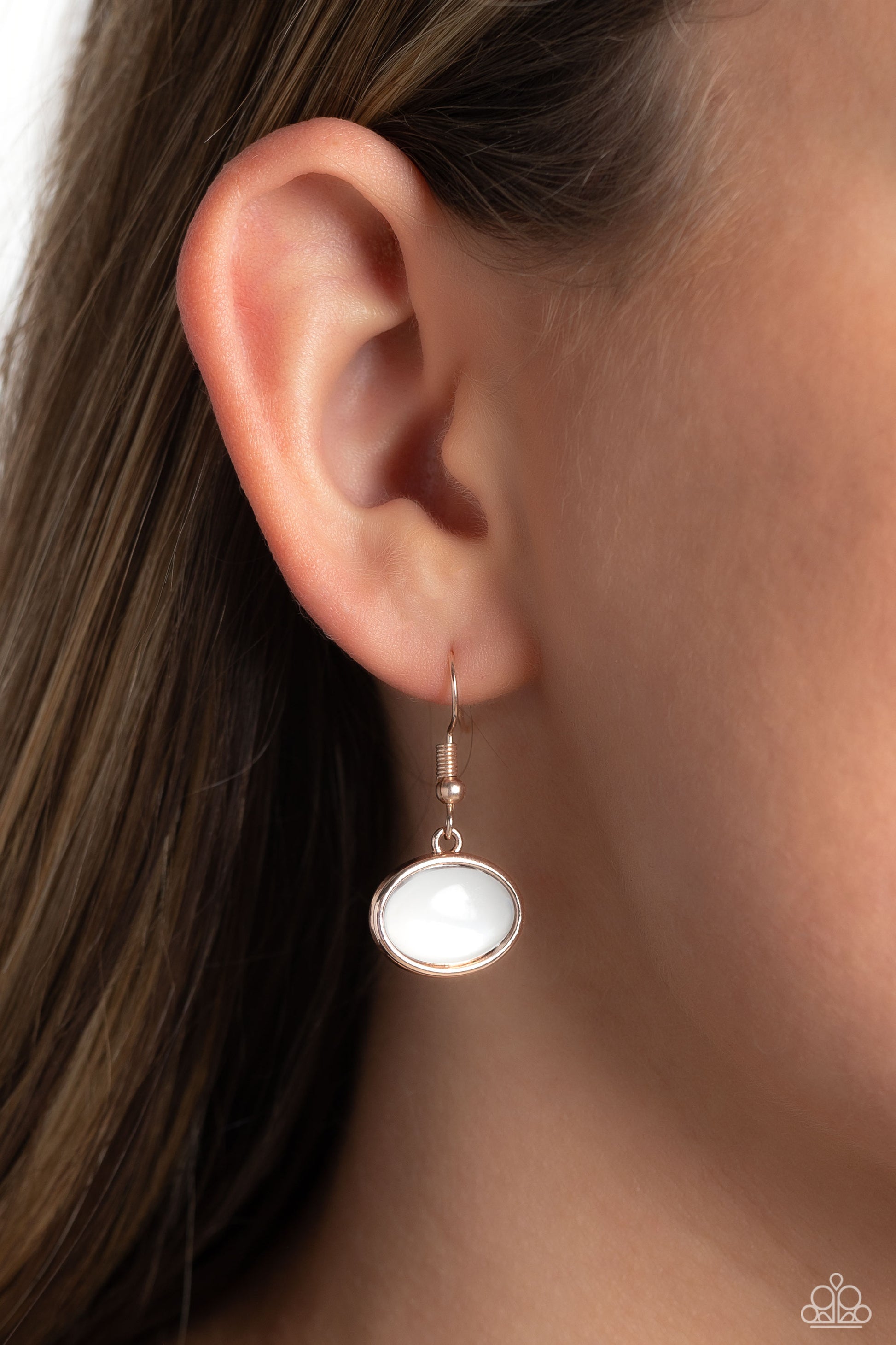 Pressed in abstract rose gold frames, an opalescent, oversized, white acrylic piece and milky oval acrylic piece drips from the bottom of an elongated rose gold chain for a basic geometric design. Features an adjustable clasp closure.