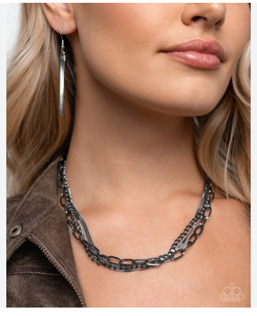 An intense display of mismatched gunmetal and silver chains, including a paperclip, classic, and herringbone chain, boldly layer below the neckline, creating an unmatched, industrial vibe. Features an adjustable clasp closure.