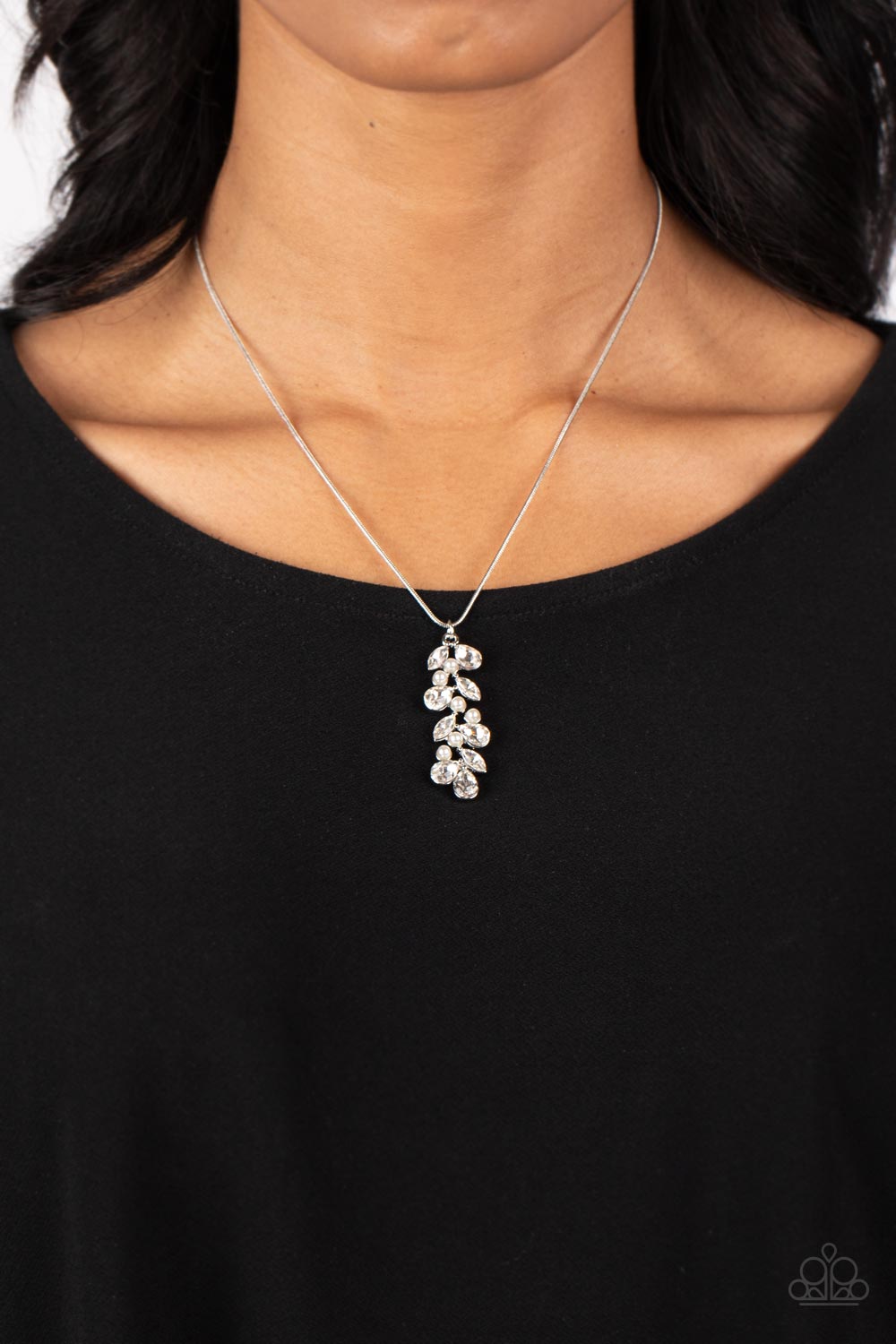 Dainty faceted teardrop- and marquise-cut gems climb around clusters of dainty white pearls, creating an elongated pendant that slides elegantly along a skinny silver snake chain. Features an adjustable clasp closure.