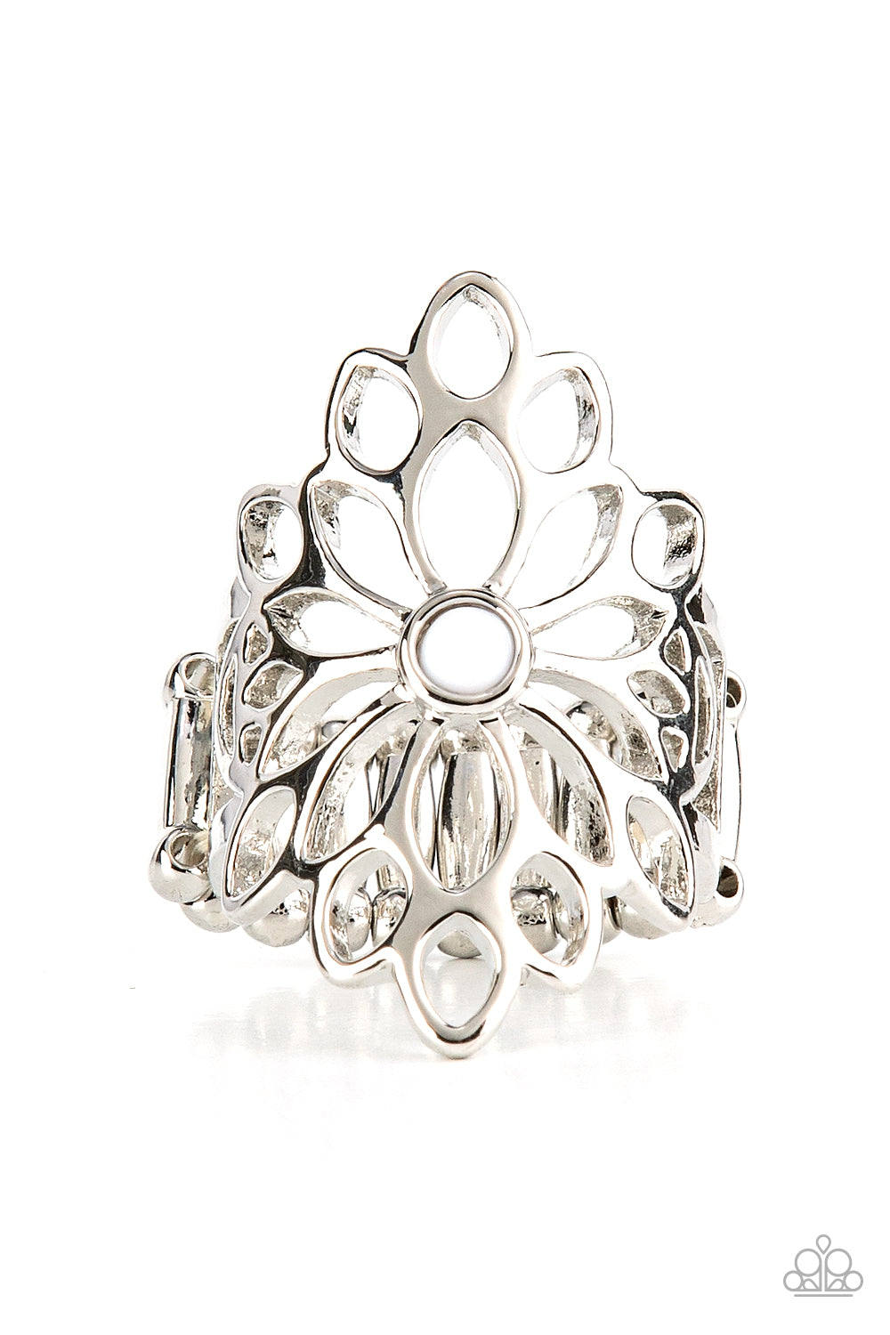 A smattering of airy silver petals blooms from a tranquil white bead, creating an enchanting floral centerpiece atop the finger. Features a stretchy band for a flexible fit.