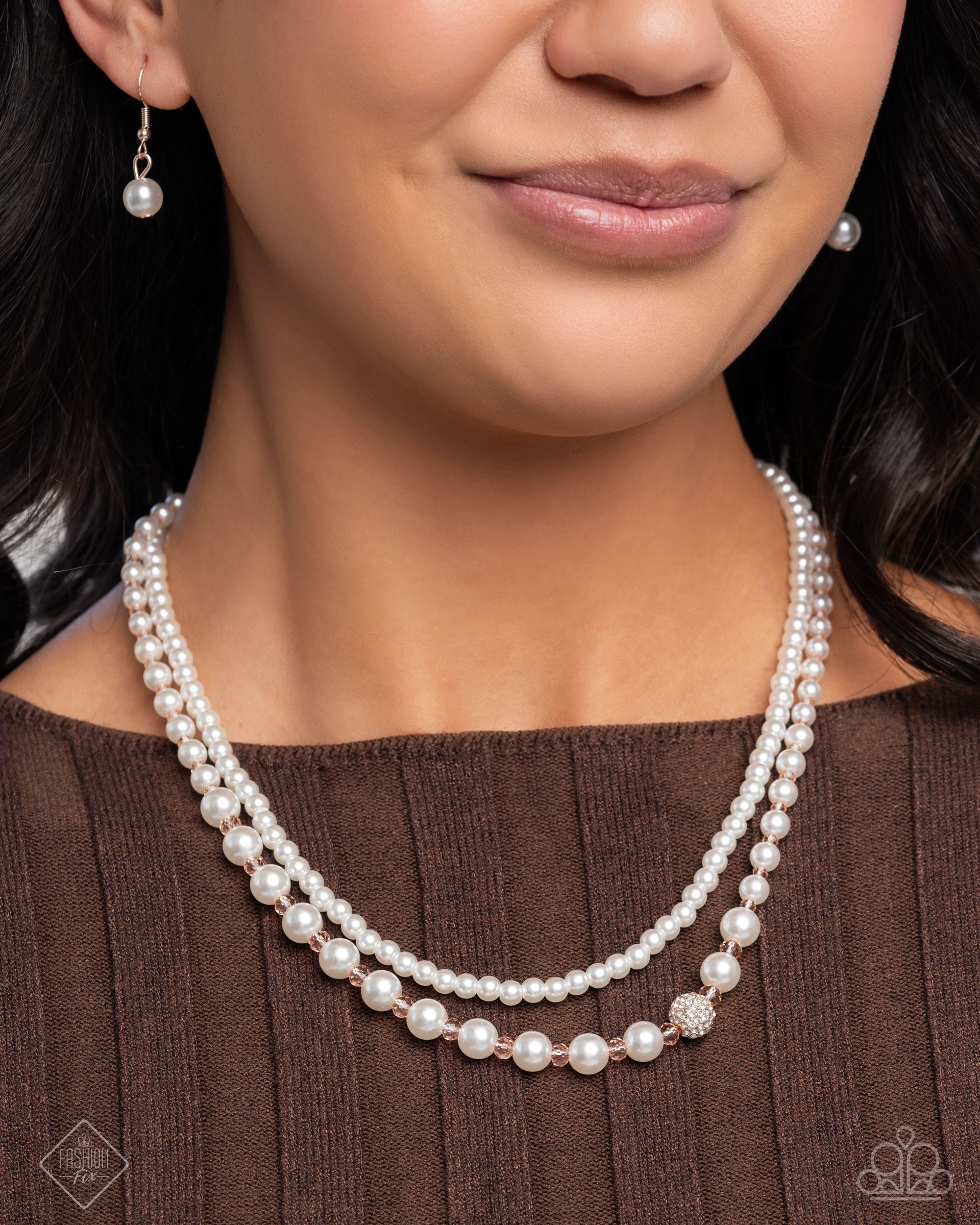 Infused along invisible strings, a collection of classic white pearls in varying sizes layer below the neckline. Light pink crystal-like beads alternate below the collar on the oversized pearly strand, while a solitaire, white rhinestone-embellished rose gold ornament is featured for an added hint of shimmer. Features an adjustable clasp closure.