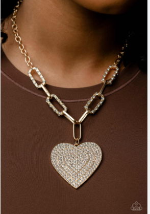 Elongated, oversized gold links, encrusted with a blinding display of white rhinestones and shimmery gold accents connect a classic gold chain to an exaggerated gold heart pendant for a romantically refined finish. Featured on the oversized gold heart, layers upon layers of glitzy white rhinestones emboss across its entire surface as the hearts gradually increase in size from the center