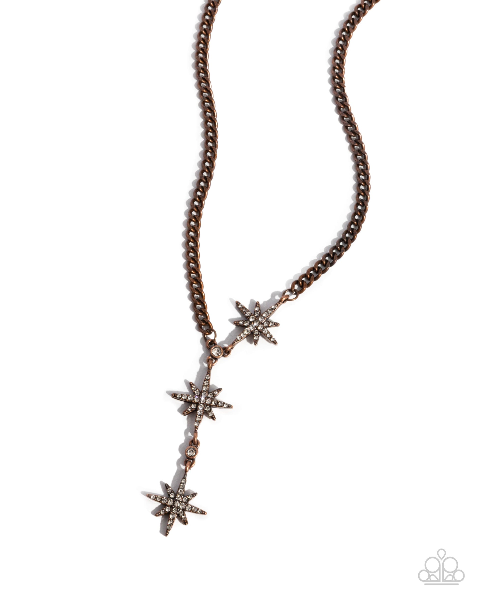 Dusted in white rhinestones, a trio of three-dimensional copper stars alternates with solitaire white rhinestones in copper fittings, twinkling along a y-shaped copper curb chain for a creatively cosmic look. Features an adjustable clasp closure.