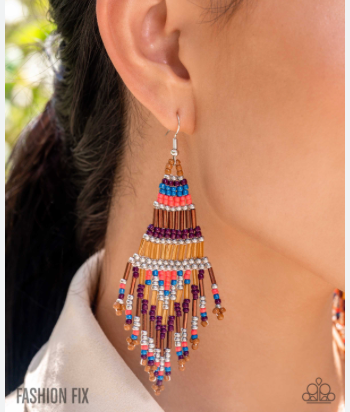 Featuring copper, silver, Peach Pink, Damson, Lyons Blue, and Bronze Brown seed beads, dainty beaded tassels swing from a beaded triangular frame for a colorfully free look. Earring attaches to a standard fishhook fitting.